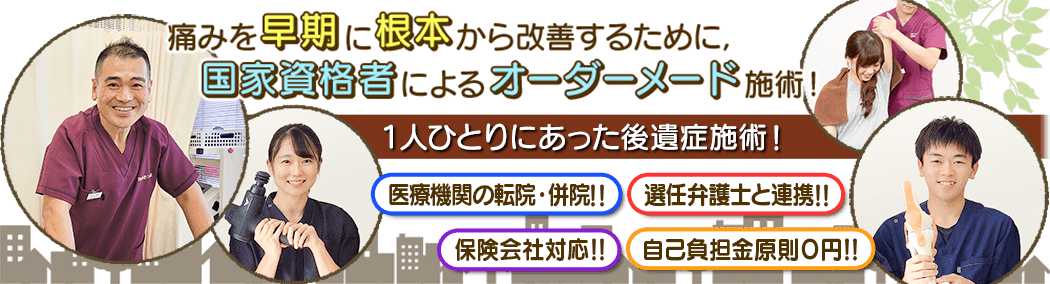 このような他の部位への負担を減らし、痛みや不調の広がりを防ぐためにも、適切な後遺症施術を受けていただくことはとても重要です。