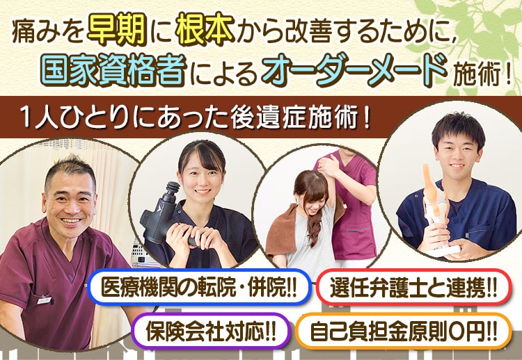 このようなケガを後遺症として残さないようにするためには、事故後のケガの扱いを得意としている整骨院を通院先に選ぶことが大切です。
